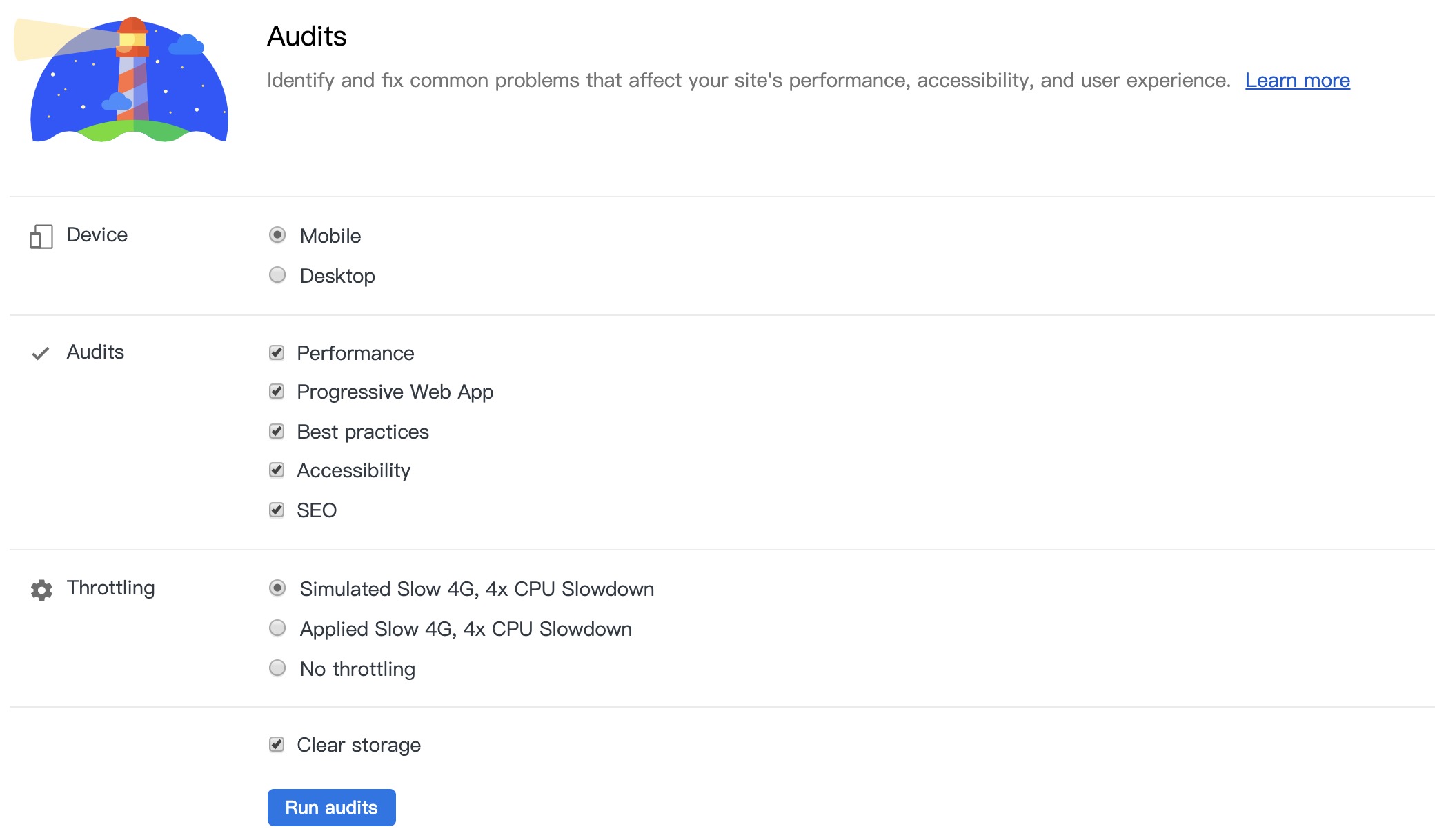 Audits 其实就是 LightHouse,LightHouse 是Google开源的一个自动化测试工具,它通过一系列的规则来对网页进行评估分析,最终给出一份评估报告。它的面板是这样的: