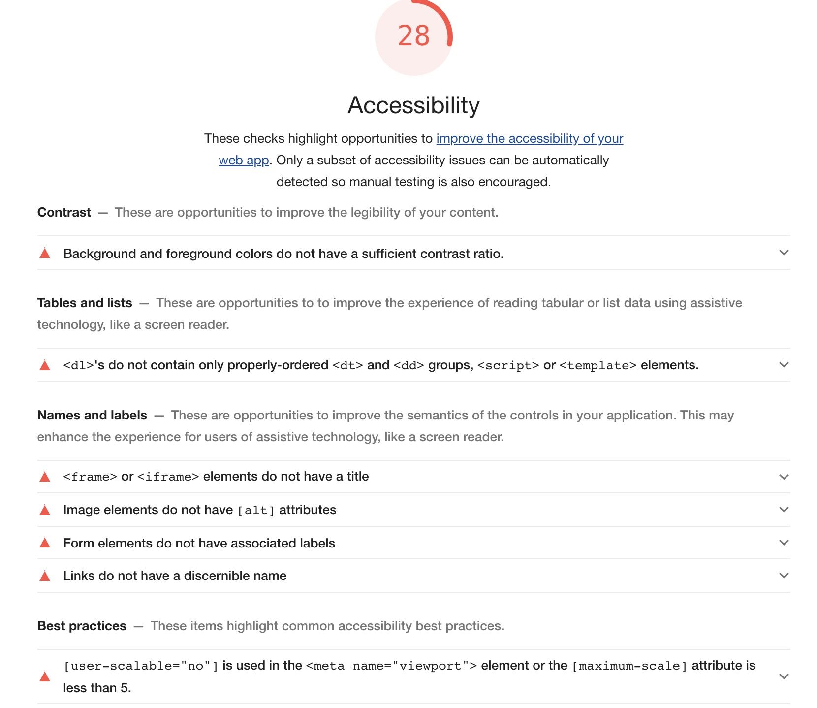 辅助功能类别测试屏幕阅读器的能力和其他辅助技术是否能在页面中正常工作。例如:按元素来使用属性,标签使用是否规范,img 标签是否缺少 alt 属性,可辨别的元素命名等等。这一项我们不展开讲,但是还是建议大家按照审计建议修改一下网页。