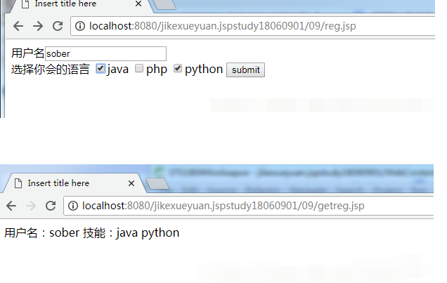 如果想不需要show.jsp也能显示,那么(删除掉show.jsp)+(删除跳转)+(在getreg.jsp页面体里添加原本show.jsp的两行代码)。
