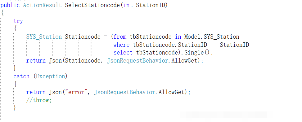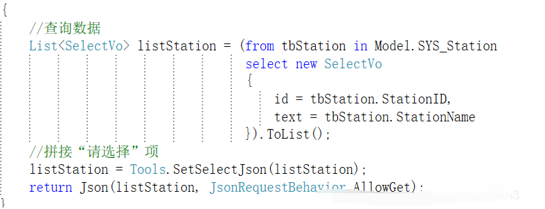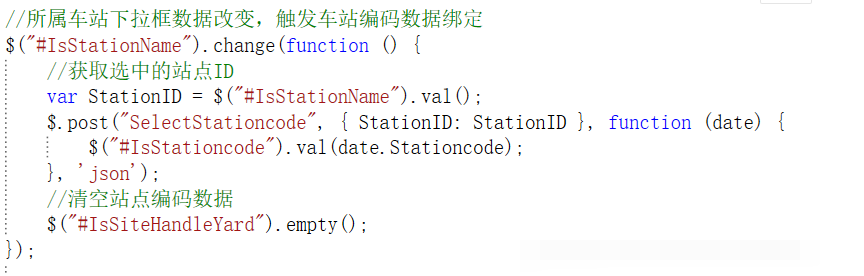 因为我们还需要得到查询出来数据的ID,所以我们还需要根据下拉框数据的绑定得到StationID主键ID再根据主键ID查询出ID数据。如下: