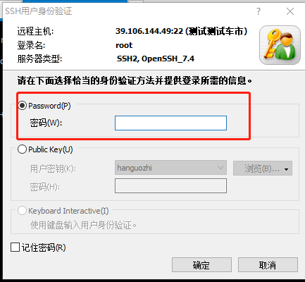但是会出现个情况,就是password那个选项不能选,这个我也不知道什么原因,然后我去阿里云后台,给服务器重置了密码,重启后再来XShell,使用上述操作,这个时候,它就可以选了,猜测有可能是没有设置密码,导致这个不能选。