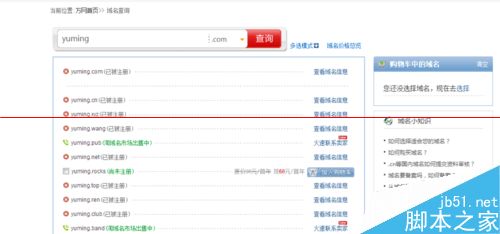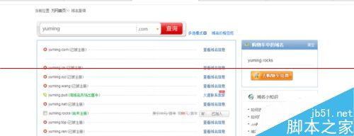 4、会出现搜索结果,找到尚未注册而又满足自己要求的域名,点击域名后面的加入购物车