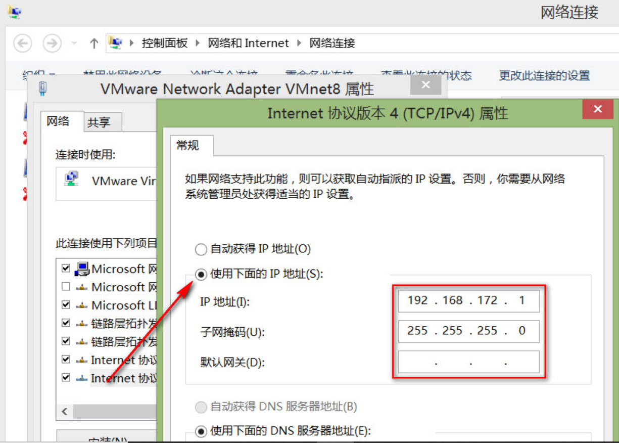 可以看出,该IP地址为192.168.172.168,然后就可以到Windows下设置VMware Network Adapter VMnet8,其中VMnet8的IP地址和默认网关和虚拟机要相同(保持和虚拟机IP保持在同一个网段)