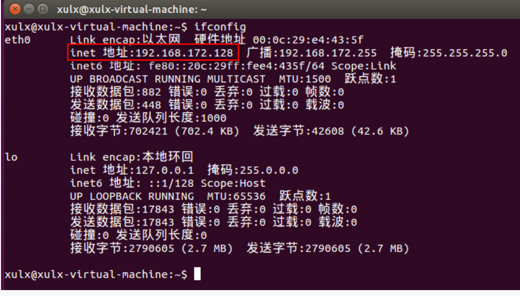 进入到Ubuntu下,先查看Ubuntu虚拟机的IP配置,打开终端(Ctrl+Alt+T),通过ifconfig命令查看,可以看到Ubuntu下的IP地址信息。