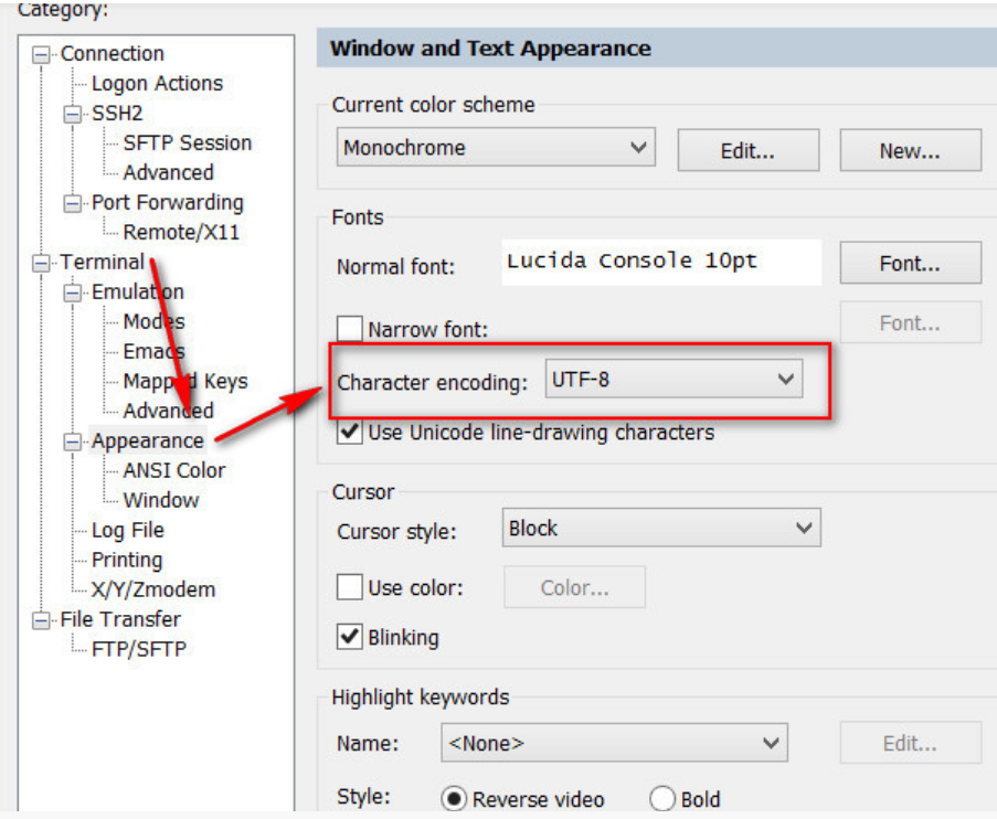 解决办法Options->Session Options->Terminal->Appearance,Character选择UTF-8。