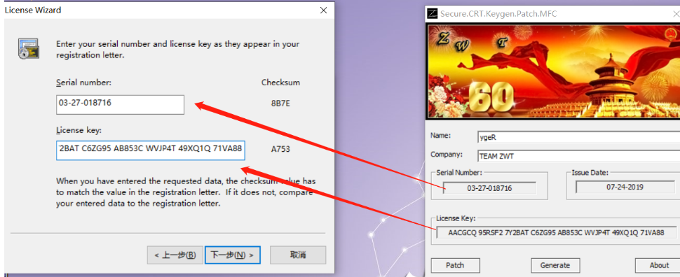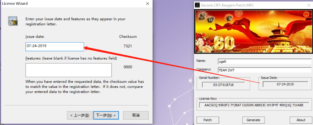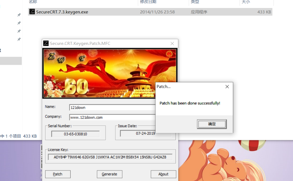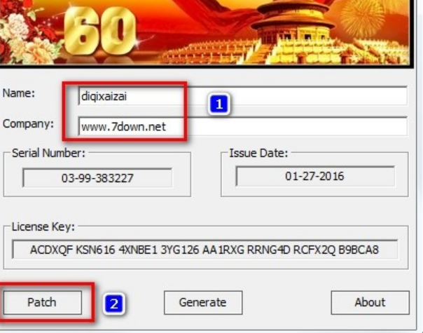 5、安装完成后打开注册机。首先填写注册机上Name一栏:121down。Company一栏填写:www.121down.com。然后点击”Pctch“。