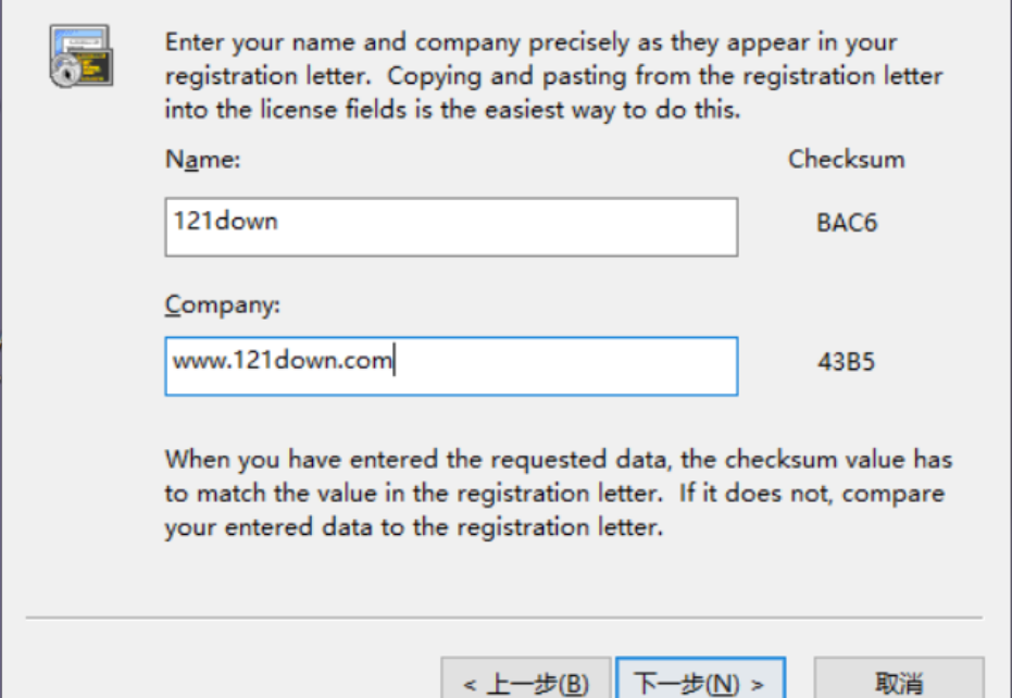 10、接下来将Neme一栏121down和Company一栏:www.121down.com复制到注册界面。然后点击”下一步“。