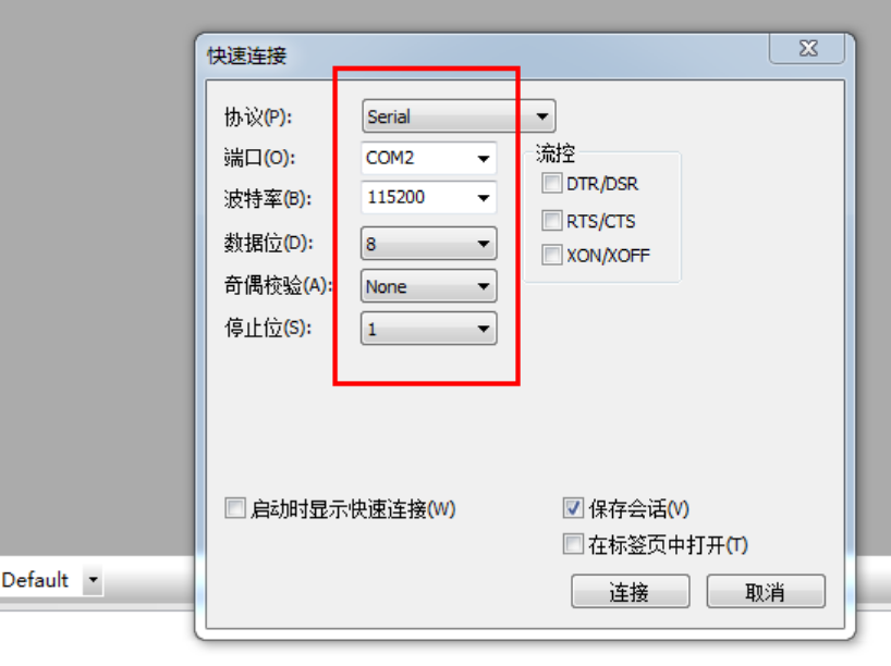 协议选择串口,波特率设置为115200,流控三个选项全不选,其他的保持默认就行,然后点连接。