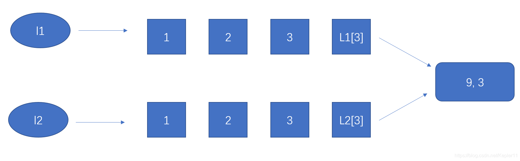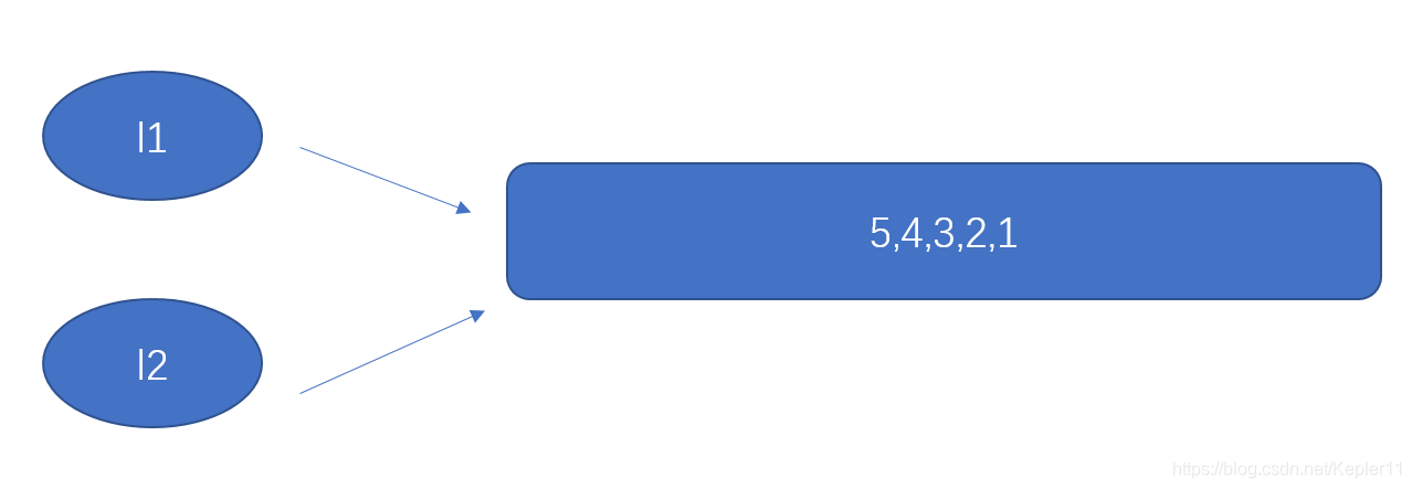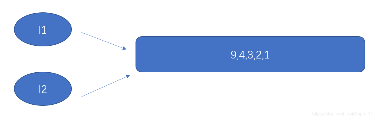 从结果来看,l1和l2地址是一样的,也就是说l1和l2指向的是同一块内存区域,显然,通过 l2 = l1 操作,l1和l2都成了指向同一块内存地址的“指针”,也就是说这个操作是为l1取了一个别名,也可以说l2是l1的一个引用。用一张图来解释: