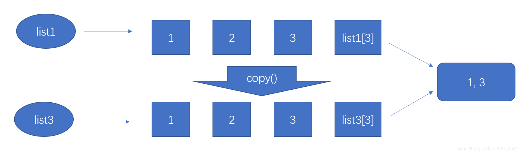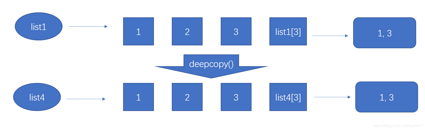 list1 = [1,2,3,[1,3]] list2 = list1[:] list3 = copy.copy(list1) list4 = copy.deepcopy(list1) list1[3][0] = 9 print(list1) # [1, 2, 3, [9, 3]] print(list2) # [1, 2, 3, [9, 3]] print(list3) # [1, 2, 3, [9, 3]] print(list4) # [1, 2, 3, [1, 3]] print(id(list1[3])) # 2927923172616 print(id(list2[3])) # 2927923172616 print(id(list3[3])) # 2927923172616 print(id(list4[3])) # 2927967190728