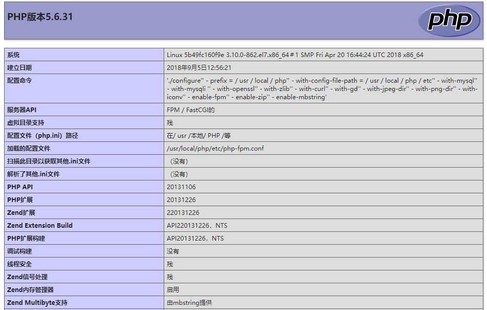 #创建一个叫做lnmp的网络 docker network create lnmp dad428646d8f8278f36b80b3b960493aee8be1960bb1f505bfeebc97022b6385 docker network ls NETWORK ID NAME DRIVER SCOPE 0604a9338e1b bridge bridge local b68e9da0b1e6 host host local dad428646d8f lnmp bridge local cf4b2d0b4394 none null local #创建nginx-php网页挂载目录 mkdir -p /www #启动php容器 docker run -dit --name lnmp-php --net lnmp --mount type=bind,src=/www,dst=/usr/local/nginx/html php:1 5b49fc160f9e42364238a937149bbb475036b8a28feddf0fe05c1e70b414a151 #启动nginx容器 docker run -dit --name lnmp-nginx --net lnmp -p 8888:80 --mount type=bind,src=/www,dst=/usr/local/nginx/html nginx:1 7ce4d14cf756859e814186090a12b770916f150ed2a5fab2f0dc6ba8c347aab8 docker ps -a CONTAINER ID IMAGE COMMAND CREATED STATUS PORTS NAMES 7ce4d14cf756 nginx:1 "./sbin/nginx -g 'da…" 16 seconds ago Up 15 seconds 0.0.0.0:8888->80/tcp lnmp-nginx 5b49fc160f9e php:1 "./sbin/php-fpm -c /…" 6 minutes ago Up 6 minutes 9000/tcp lnmp-php #创建测试页面php.info echo "<?php phpinfo();?>" > /www/index.php