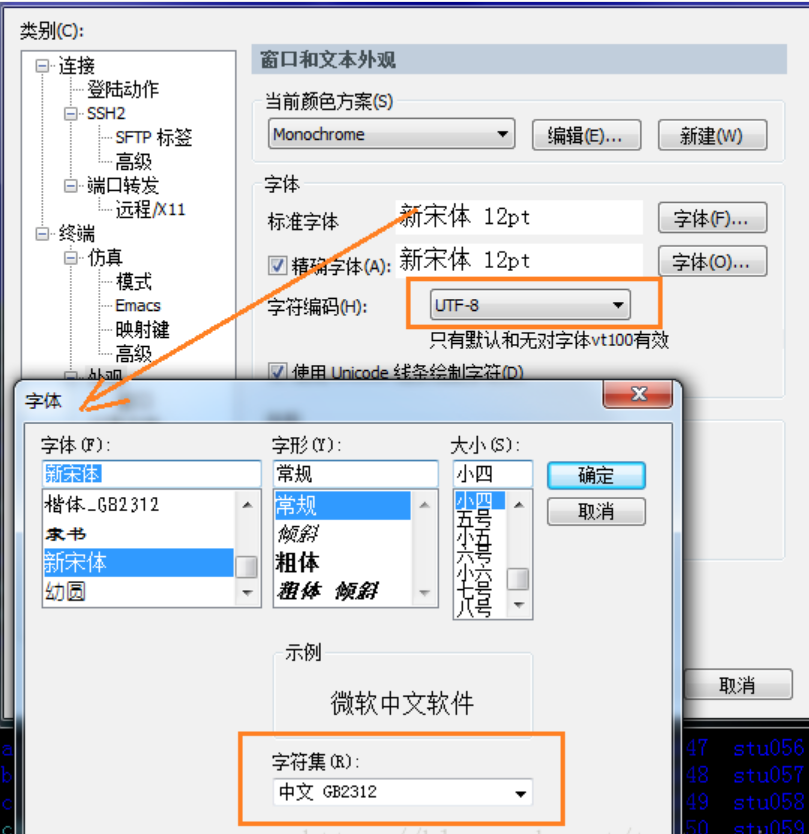 5. 服务器设置完以后设置客户端SecureCRT,进入选项->会话选项->终端->外观选项中按照下图配置