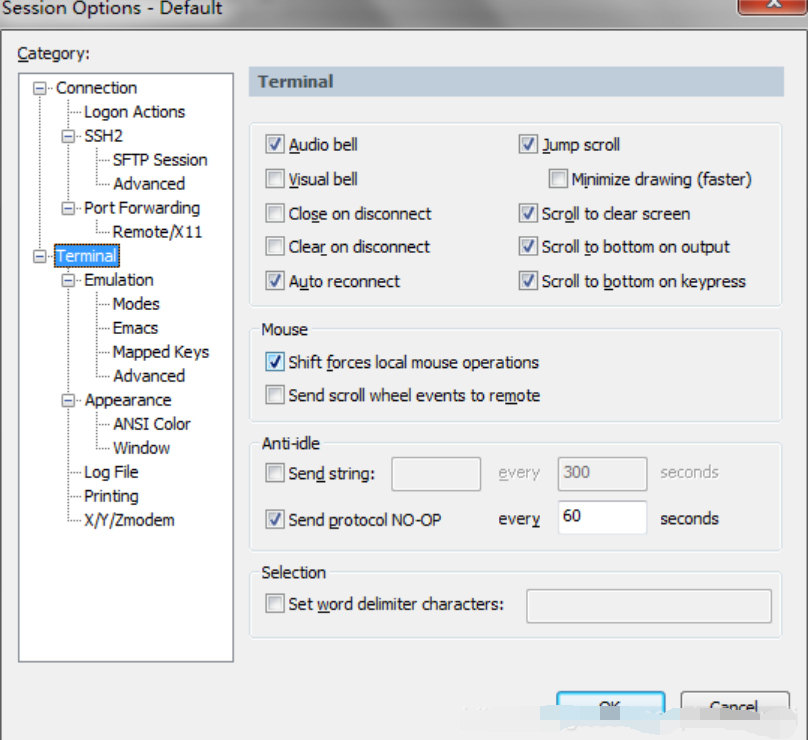 【Options】->【Global Options】->【General】->【Default Session】,点击【Edit Default Settings】按钮,在【Terminal】中钩上【Send protocol NO-OP】【every 60 seconds】,这样可以保证不会因为一段时间没有操作,而丢掉连接。
