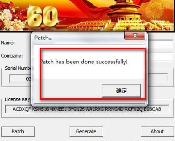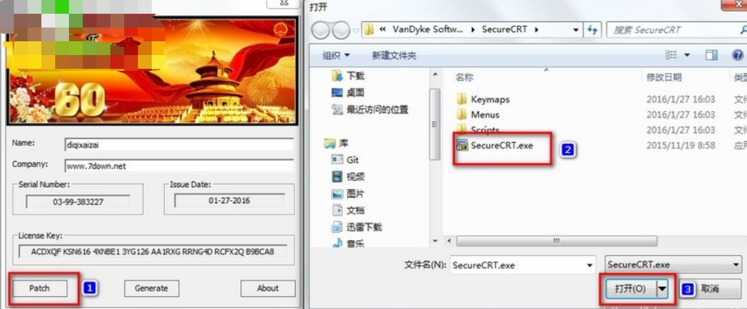 b、打开注册机keygen.exe文件(Windows vista ,7,8,10需要以管理员身份运行),点击【Patch】按钮,会让你选择文件 ,选择SecureCRT.exe可执行文件,还会再提示LicenseHelper.exe文件。确定后都会提示成功。