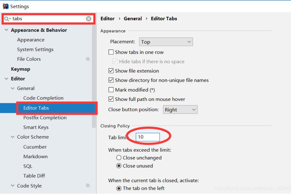 然后搜索tabs,在Editor->General->Editor Tabs里面修改图中数字,个人设置为20-30基本就够用了。