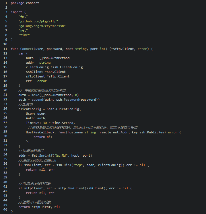 连接ssh的主要用的就是 golang.org/x/crypto/ssh这个包, 利用github.com/pkg/sftp来进行文件传输和远程文件操作,下面的代码都有详细注释直接看注释就好了。