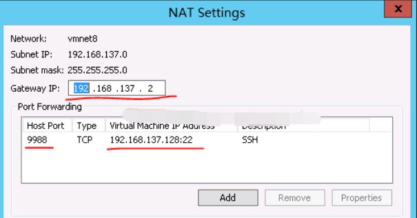 在VMware Network Editor对话框中设置,先设置画红线部分,具体如下图。