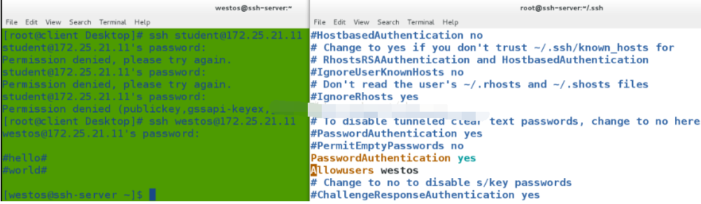 49 AllowUsers student westos ##用户白名单,只有在名单中出现的用户可以使用sshd建立shell