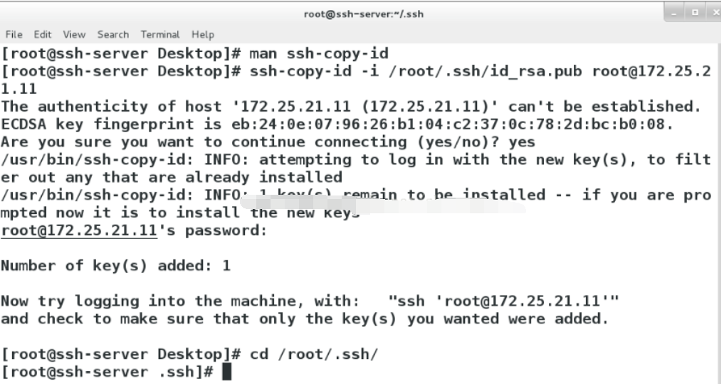 [root@server0 ~]# ssh-copy-id -i /root/.ssh/id_rsa.pub root@172.25.0.11