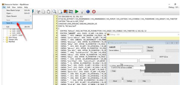 第八步:选择"File"->"Save As"菜单项,将修改后的tftpd.exe应用程序仍以.exe后缀格式文件导出到电脑上。