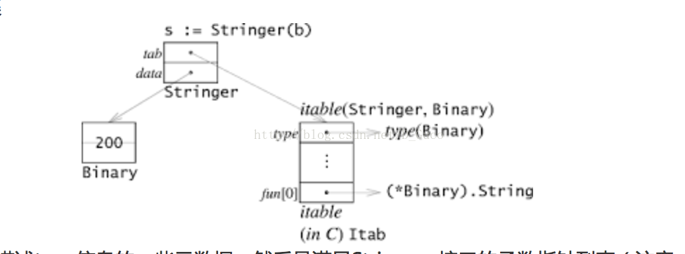 观察itable的结构,首先是描述type信息的一些元数据,然后是满足Stringger接口的函数指针列表(注意,这里不是实际类型Binary的函数指针集哦)。因此我们如果通过接口进行函数调用,实际的操作其实就是s.tab->fun[0](s.data) 。是不是和C++的虚表很像?但是他们有本质的区别。先看C++,它为每个类创建了一个方法集即虚表,当子类重写父类的虚函数时,就将表中的相应函数指针改为子类自己实现的函数,如果没有则指向父类的实现,当面临多继承时,C++对象结构里就会存在多个虚表指针,每个虚表指针指向该方法集的不同部分。我们再来看golang的实现方式,同C++一样,golang也为每种类型创建了一个方法集,不同的是接口的虚表是在运行时专门生成的,而c++的虚表是在编译时生成的(但是c++虚函数表表现出的多态是在运行时决定的).例如,当例子中当首次遇见s := Stringer(b)这样的语句时,golang会生成Stringer接口对应于Binary类型的虚表,并将其缓存。那么为什么go不采用c++的方式来实现呢?这根c++和golang的对象内存布局是有关系的。