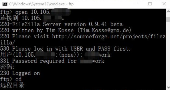 ⑤ 登录成功后,输入“cd”命令,会显示“远程目录”。