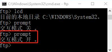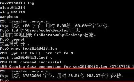 ⑧输入“prompt”命令(打开交互模式),最后输入“mget 服务器上要下载的文件名字”,按回车键,这样就可以进行下载了。