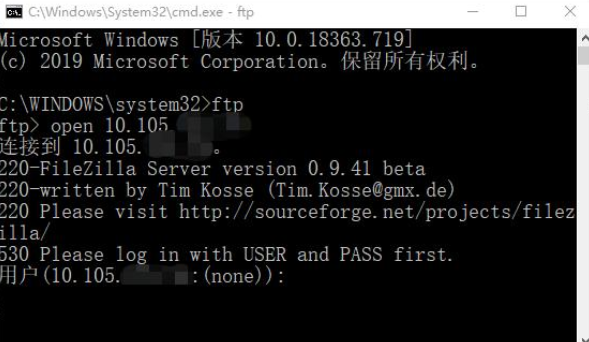 ④ 然后输入“open 服务器地址”,点击回车键。会提示你输入用户名和密码。