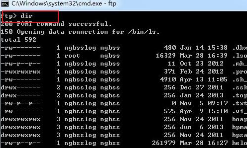 ⑥输入“dir”命令会显示目录下的文件,权限等相关信息。可以通过“cd 目录名”命令进入到要下载的文件目录下。然后输入“ls”命令显示目录(文件夹)下的所有文件。