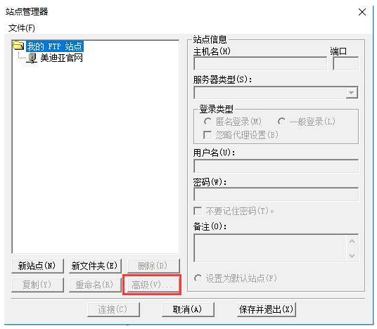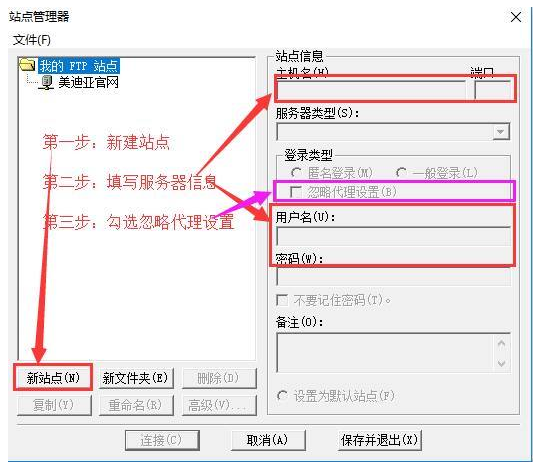 第三步:新建站点,在右侧填写你的FTP相关信息,在登录类型上,把忽略代理设置勾选上