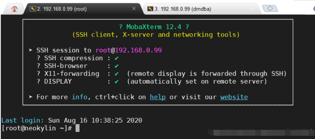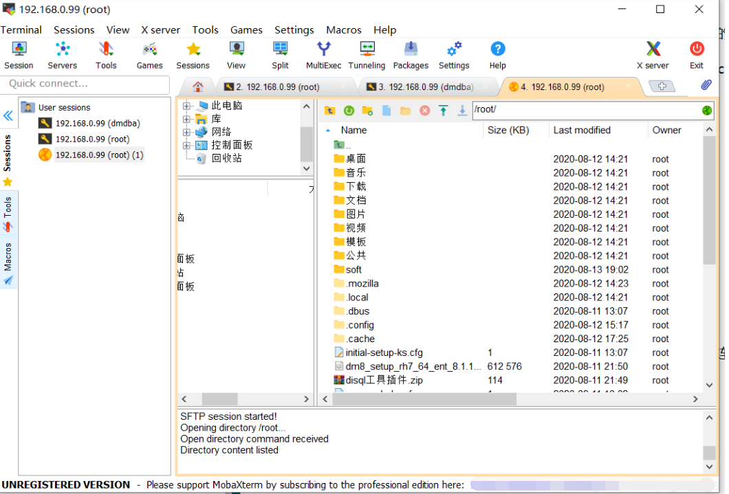 接着我重新设置了虚拟机的地址,将虚拟机地址设置为192.168.0.99,再次ping成功,而且通过MobaXterm与虚拟机建立SSH成功!可以通过MobaXterm在物理机和虚拟机之间进行互相传输文件啦!