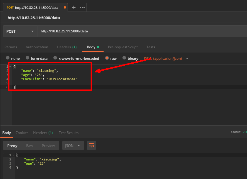 使用postman作为客户端发送带json请求体的请求,如下图:
