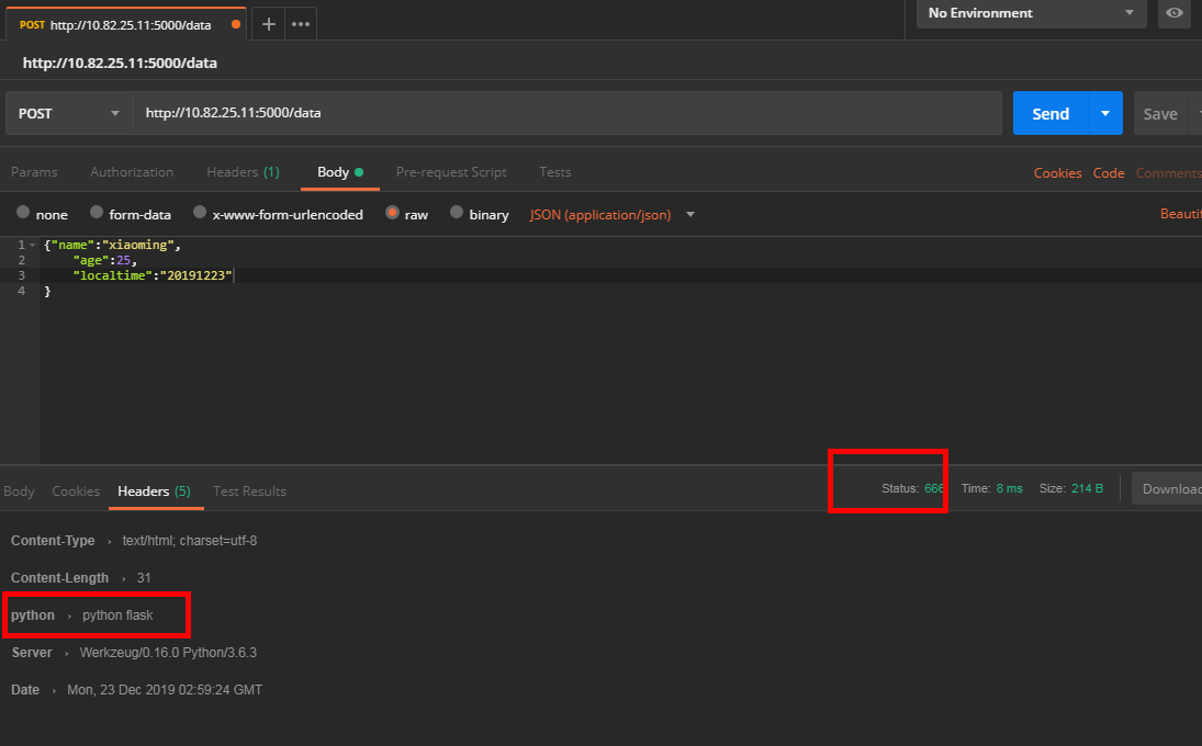 运行该py文件,在postman中发送请求,查看响应信息,如下图,变成的我们自定义设置的响应头和状态码