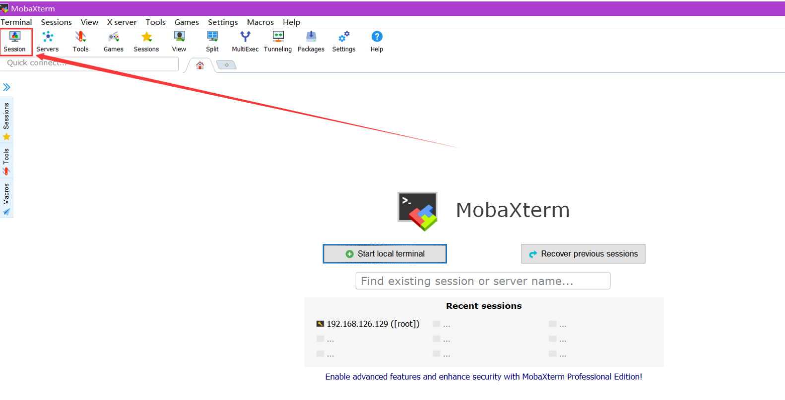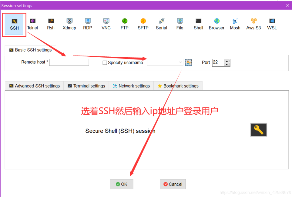 打开工具,点击【Session】–>【SSH】进行相关配置即可进行连接。
