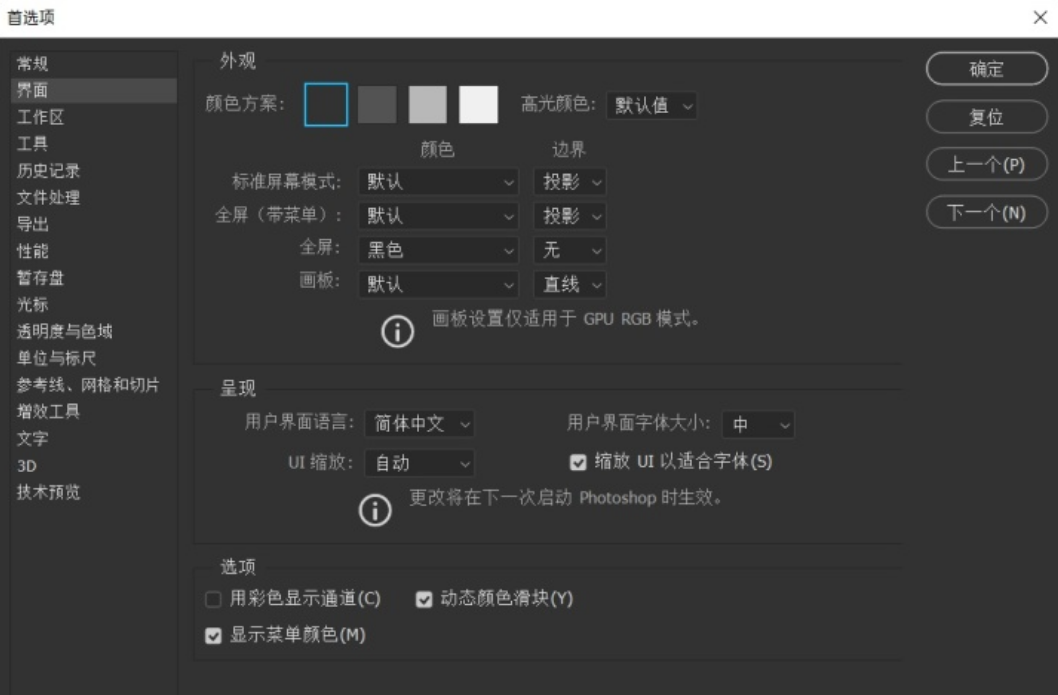对了,Photoshop中对用户界面语言的修改十分简单,只需要在Photoshop 2020内单击“编辑”选项卡,选择子菜单“首选项”,选择子菜单“界面”,呼出选项卡。找到子单元“呈现”便可以修改用户界面语言。