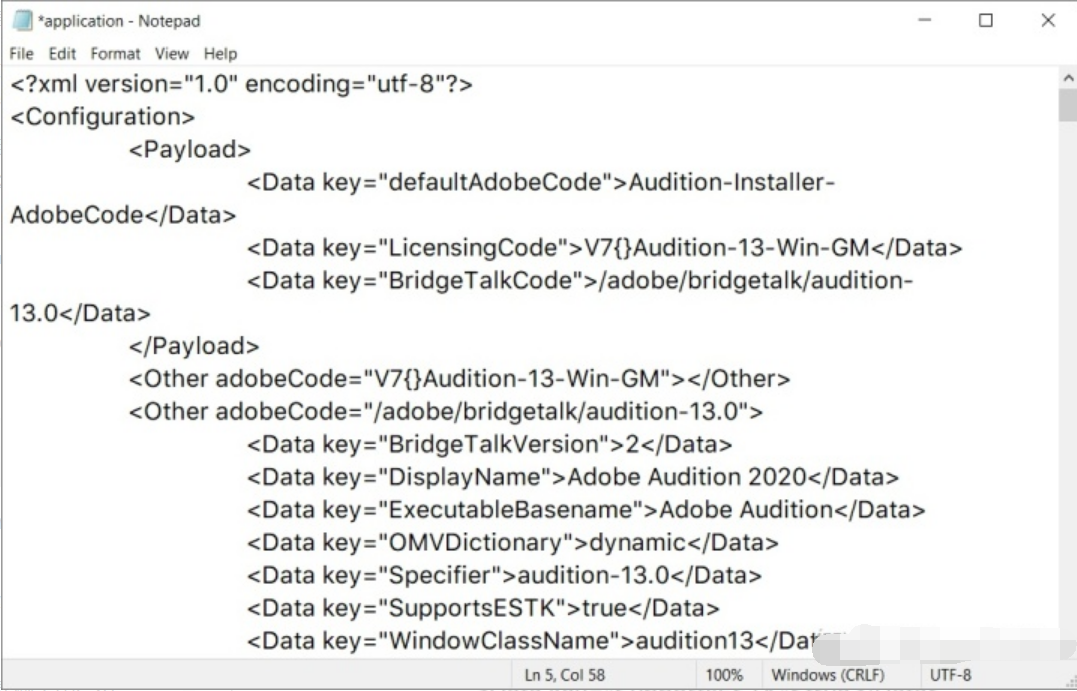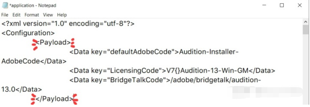 然后将上面提到的语言设置代码粘贴到中间部分的“……Audition-13-Win-GM</Data>”后面,不需要换行。