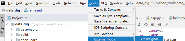 配置完打开 pycharm 的扩展工具即可在当前工程打开designer;