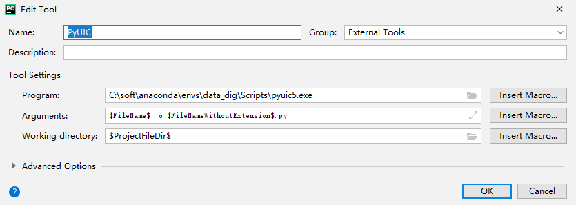参数:$FileName$ -o $FileNameWithoutExtension$.py