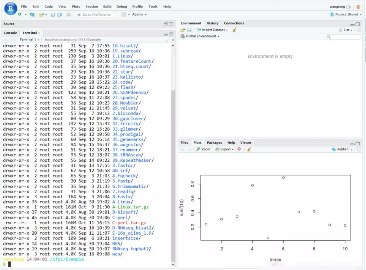 最后,在给大家介绍一下Rstudio和Rstudio-server的新功能。现在的Rstudio能都连接本地终端,如果是在服务器端,就可以登录服务器。也就是不需要任何工具,只在任何浏览器中登录Rstudio-server,就可以直接连接服务器,非常方便。它的优势不言自明,无需携带安装你熟悉的工具,只需要通过浏览器登录既可访问服务器。