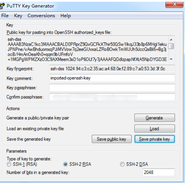 下载PuTTYkey,选择Load将Linux下的id_dsa文件导入,将Linux环境下的ssh密码填入,当时设置为空密码,所以此处填了空格;选择Save private key,保存为后缀名为id_dsa.ppk。