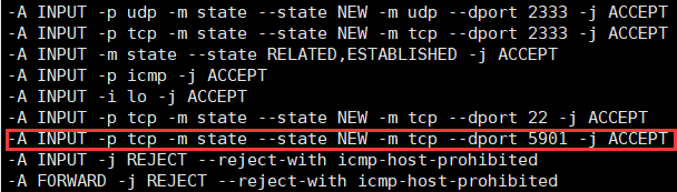 新增一行:-AINPUT-ptcp-mstate--stateNEW-mtcp--dport5901-jACCEPT