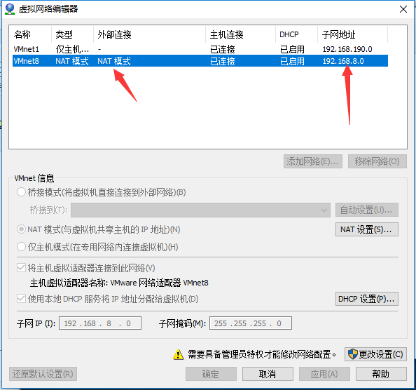 修改对应的NAT模式,子网地址的前三位要与window,internet协议版本里的IP地址的前三位一致。