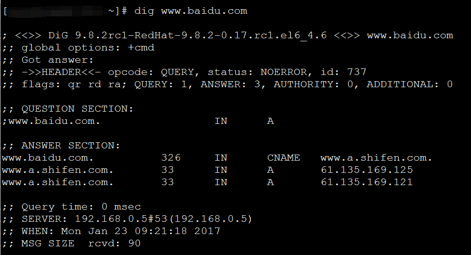 www.baidu.com. 326 IN CNAME www.a.shifen.com. //1