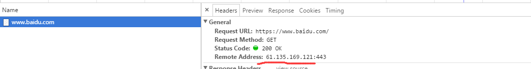 我们可以看见 www.baidu.com 对应 61.135.169.121 这个ip。我们再看一下浏览器请求走的ip,可以看见,走的 61.135.169.121 这个