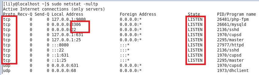 图1中主要看监控状态为LISTEN表示已经被占用,最后一列显示被服务mysqld占用,查看具体端口号,只要有如图这一行就表示被占用了。