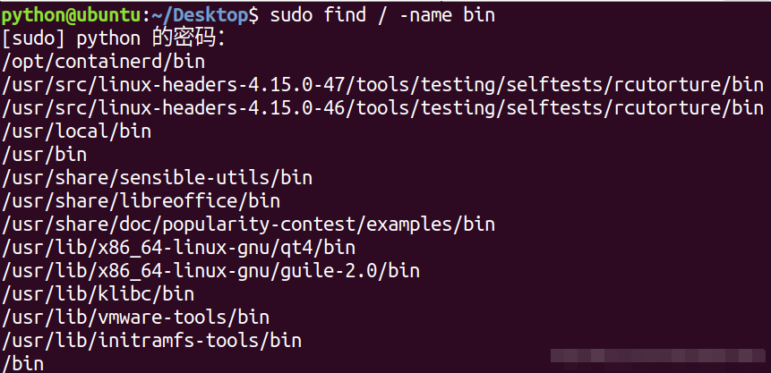 举例说明:在整个系统中查找所有bin文件命令: sudo find / -name bin