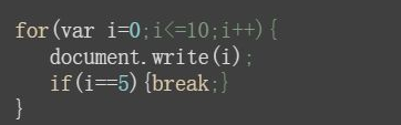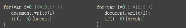 上面这个break实例,输出的结果为:12345,当i的值等于5的时候直接通过break跳出了循环,不再继续往下运行。