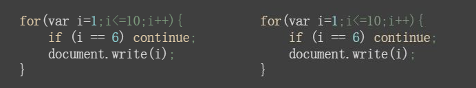上面这个continue实例,输出的结果为:1234578910,当i的值等于6的时候直接跳过,继续执行循环。