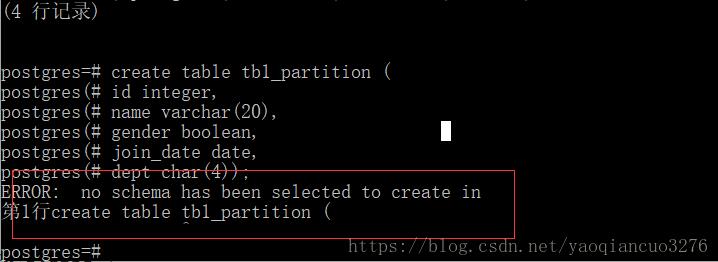 错误原因:在本地postgresql.conf 配置了 search_path = ‘$user' ,所以在使用的时候需要先创建当前用户对应的schema,如果不存在,则会提示错误