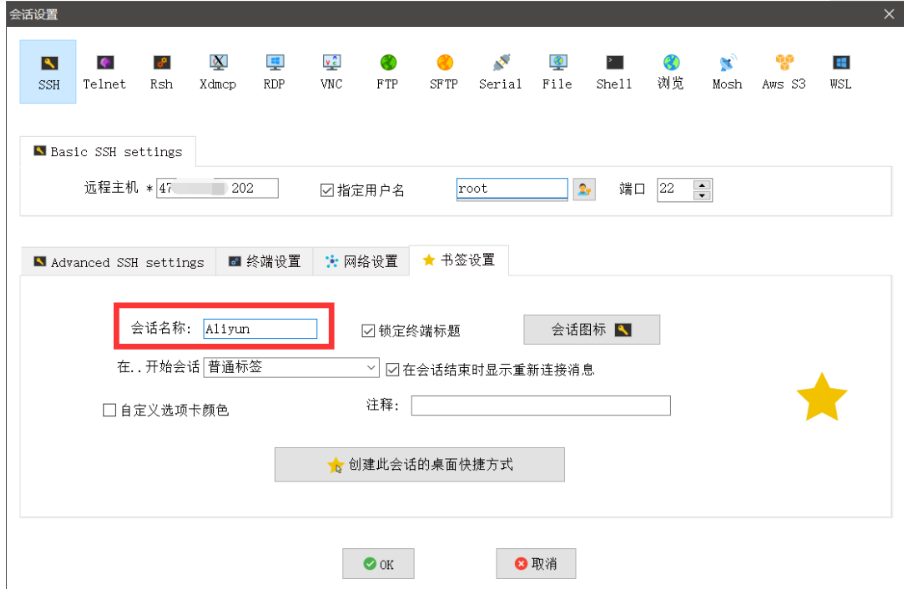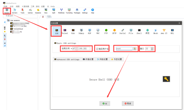 点击Session,然后选择SSH,输入服务器IP地址。如果你安装的是虚拟机,可在终端输入ifconfig -a ,回车查看。